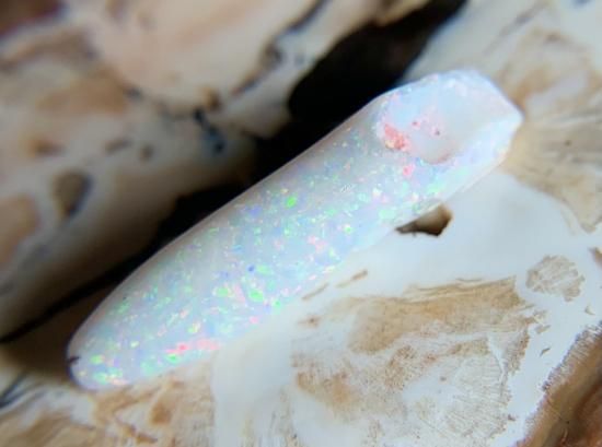 約1億年前白亜紀に生きていたべレムナイト(古代イカ)の化石オパールです。オーストラリアンオパールは世界的にも珍しい堆積成オパールですので化石オパールが見つかることがあります。オーストラリア南部のクーバーペディは1億年前に海中だったため海洋生物の化石オパールが発掘されることがります。遊色効果を持つ動物の化石オパールは大変貴重です。